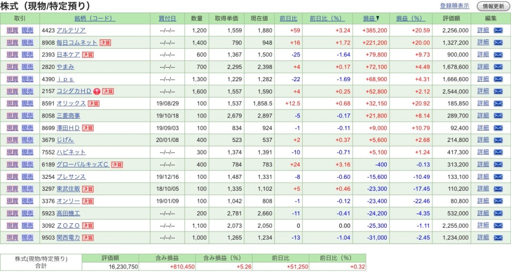 2020/01/12時点のポートフォリオです。買付余力は6,737,002円。