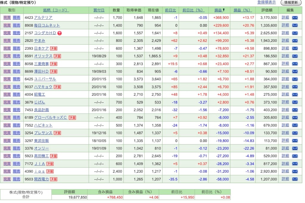 2020/01/19時点のポートフォリオです。買付余力は3,087,770円。