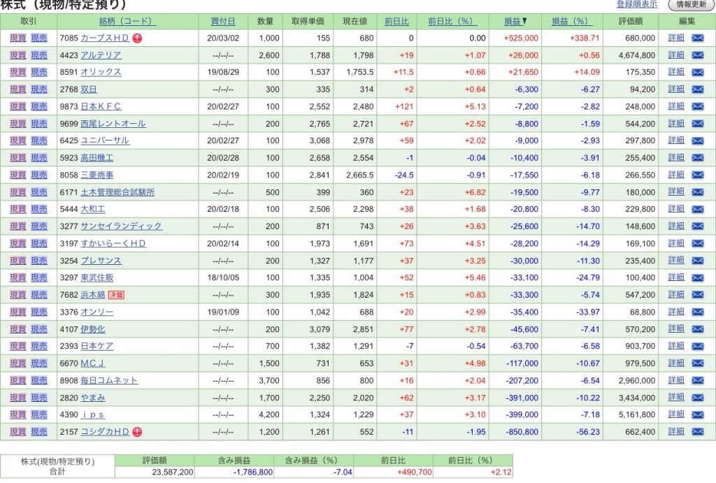 通常は週末にポートフォリオ報告をしていましたが、コシダカ、カーブスのスピンアウトの関係で、正確に反映したく本日となりました。