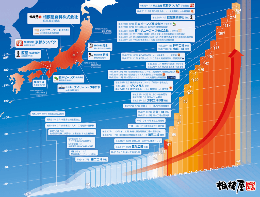 余談です。相模屋食料の詳しい説明はここでは割愛しますが、相模屋食料の成長を遡ってみると、下表の通り相模屋食料も大規模工場の稼働で売上を急拡大させてきたことが分かります。特に2005年に完成した第三工場は大きな飛躍のきっかけとなっています。第三工場新設への投資金額は41億円(参考記事)。これは当時の売上を上回る金額の投資だったとのこと。工場への大型投資という戦略はやまみと同様です。