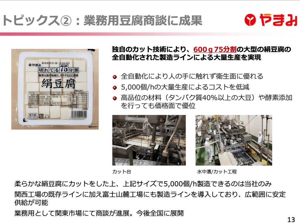 広島の豆腐メーカー。拠点のある中国地方で高シェアを誇る。2016年6月に上場。現在は東証一部。中小企業が多い豆腐業界において大規模工場の自動化設備×高付加価値商品を有していることが強み。