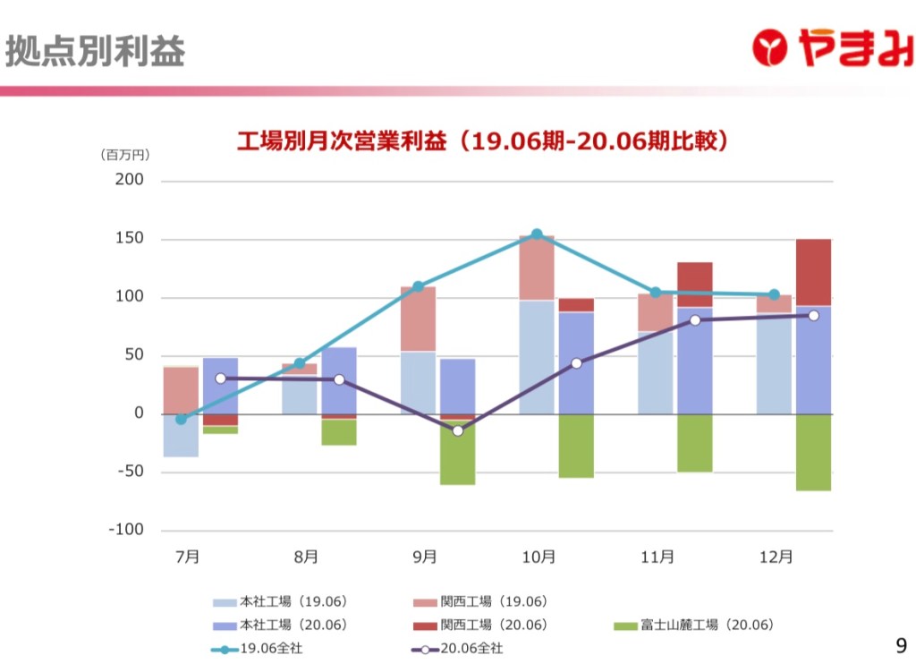やまみは全国に工場を3つ有しています(本社工場、関西工場、富士山麓工場)。下表の通り、西日本にある本社工場(2000年操業開始)、関西工場(2012年操業開始)は安定的に利益をあげています。西日本は競合が淘汰され高い利益率を維持しています。新しい3つ目の富士山麓工場(2019年秋操業開始)はまだ赤字(というよりもほぼ未稼働)。今後は富士山麓工場の操業開始を皮切りに本格的に関東市場へ進出します。