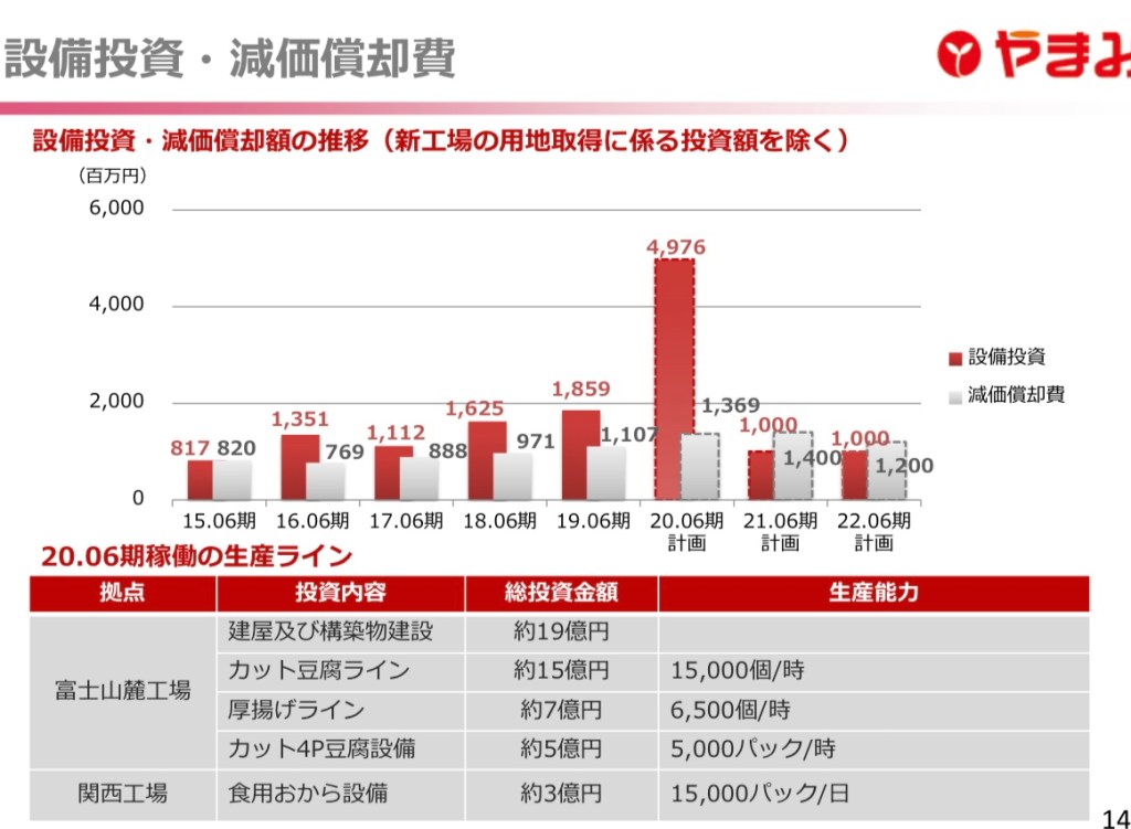 成長ドライバーである関東進出は富士山麓工場が大きな役割を担います。新設にあたり建物・設備に関わる投資額は約45億円。2020.6期の売上見込み116億円に対してその半分弱に及ぶ巨額投資です。ここまでの巨額投資が出来るのは西日本での安定した利益があるからこそ。競合他社には出来ない巨額投資です。富士山麓工場の最大生産規模は200億円ほど。現在の売上高の倍近い金額です。フル稼働すれば(フル稼働できる?というのが一番のポイント)やまみの売上高は大幅に伸びます。この巨額投資を通じてやまみは圧倒的に生産性の高い自動化製造ラインを構築しています。自動化製造ラインのメリットは①中小企業は豆腐の製造工程で多くの人の手を介されますが、やまみは機械化されていることにより賞味期限が他社よりも長いこと②製造が難しいが強い市場ニーズのある高付加価値のカット豆腐製造ができること③製品あたりの生産コストが低いことなどが挙げられます。恐らく富士山麓工場にの新設によってやまみは関東市場で最も大規模に、効率的に、低コストで、付加価値の高い豆腐を製造できる会社になったと言えるのではないでしょうか。