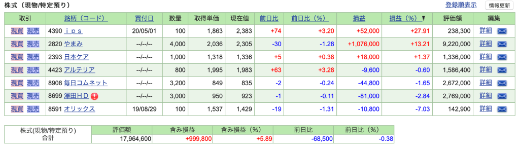 保有銘柄の利益確定を進めました。また、一時入金していた500万を出金しました。マイホーム購入資金に充てるためです(学資保険を解約してまでの入金だったのでハイリスクでしたが功を奏しました)。またやまみも過剰保有分は一旦利益確定しました。ただ、直近の決算も順調そのものだったので、継続して保有(場合によっては買い増し)していく予定です。なお、前提となるやまみの購入理由はこのエントリ(やまみ銘柄分析)に記載の通りです。