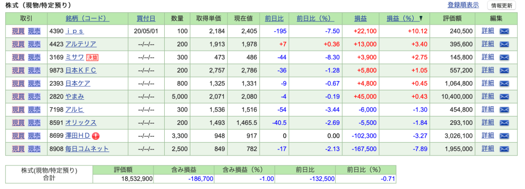 新たに日本KFC、ミサワ、アルヒを買いました。ずっと狙っていたのですが、なかなか買えずにいたところ、今回の調整局面でようやく買えました。本当はもっと下で多く買いたかったのですが、仕方ないです。結果としては少額ですが長めに応援していきたいと考えています。