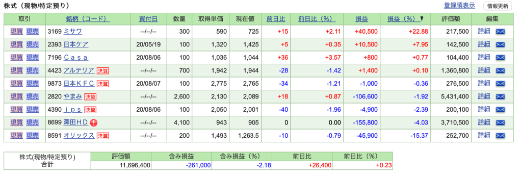 2020/08/09時点のポートフォリオです。夏休み期間中のため簡易的に。